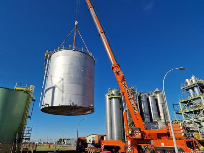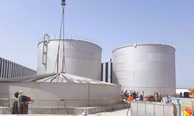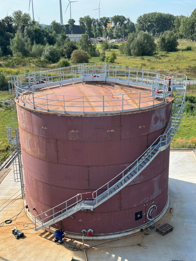 Details van de werkzaamheden: – Constructie van een nieuwe opslagtank – Hoogte 12m, diameter 20m – Volume van 3670 m3 – Materiaal : koolstofstaal – Field erected